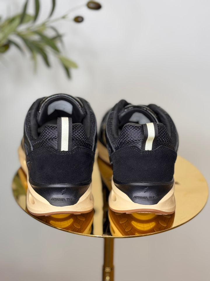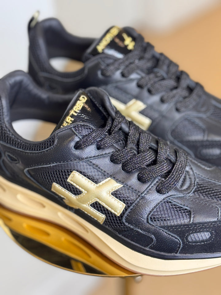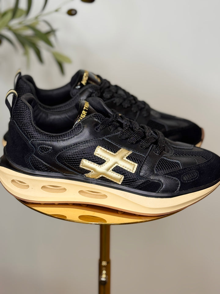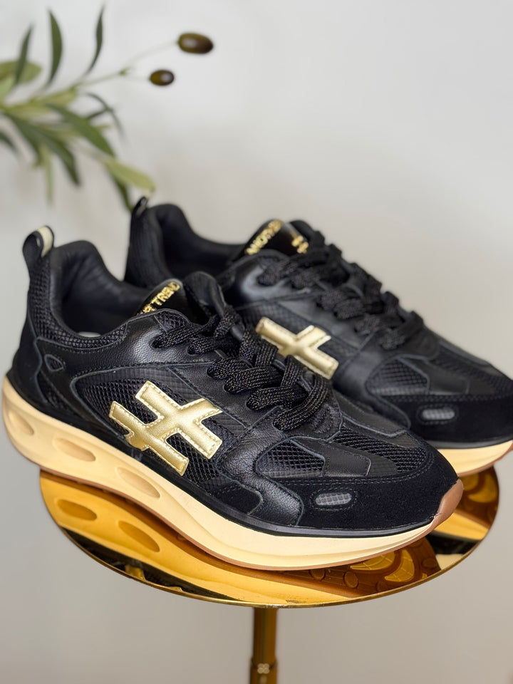 Step up your sneaker game with these bold black and gold platform trainers. Designed with a breathable mesh and faux leather upper, they deliver the perfect mix of comfort, durability, and standout style. The chunky sole with cut-out detailing adds a futuristic edge, while the metallic gold side logo brings a touch of luxe to your everyday look.