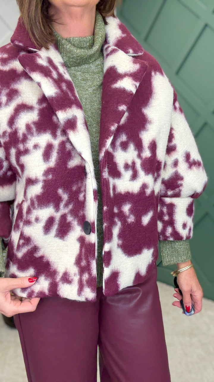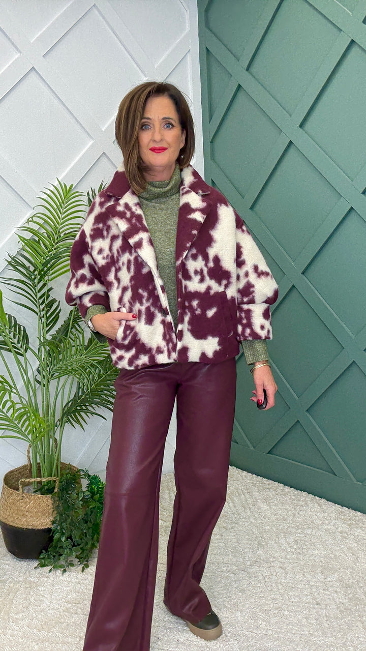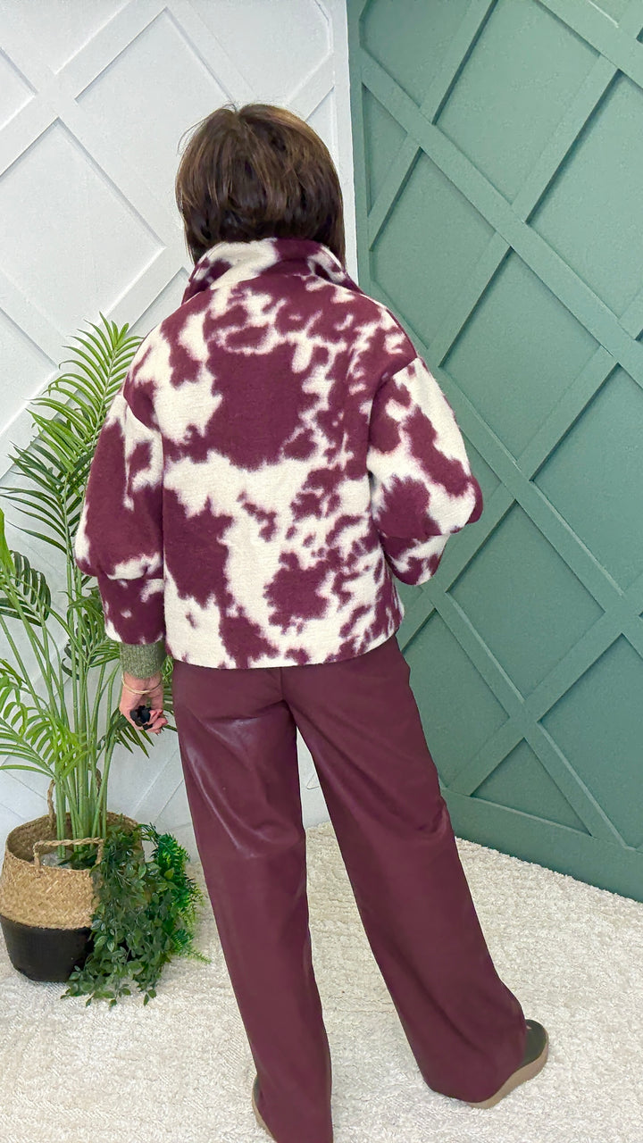 ✨ A bold cow-print design in rich burgundy and cream tones – the perfect colours of winter to brighten up your wardrobe.