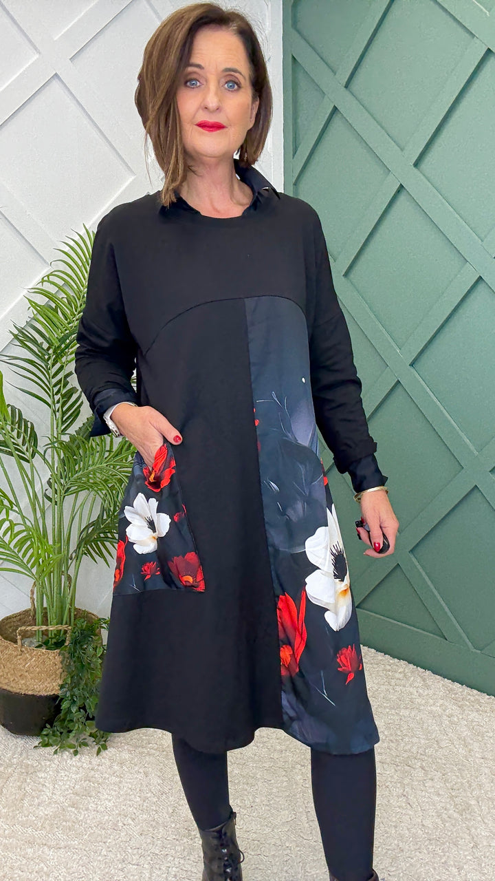 The Ezra Tunic Dress blends comfort and style with a round neckline, long sleeves, and an easy A-line silhouette. A contrast side panel and oversized pocket add a modern, functional twist.