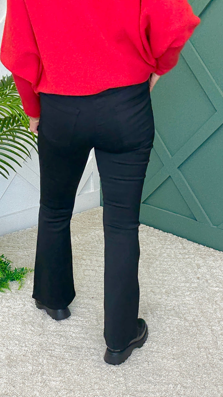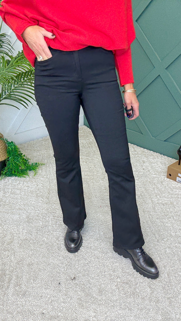 - Fitted through the thigh, flowing into a chic bootleg cut