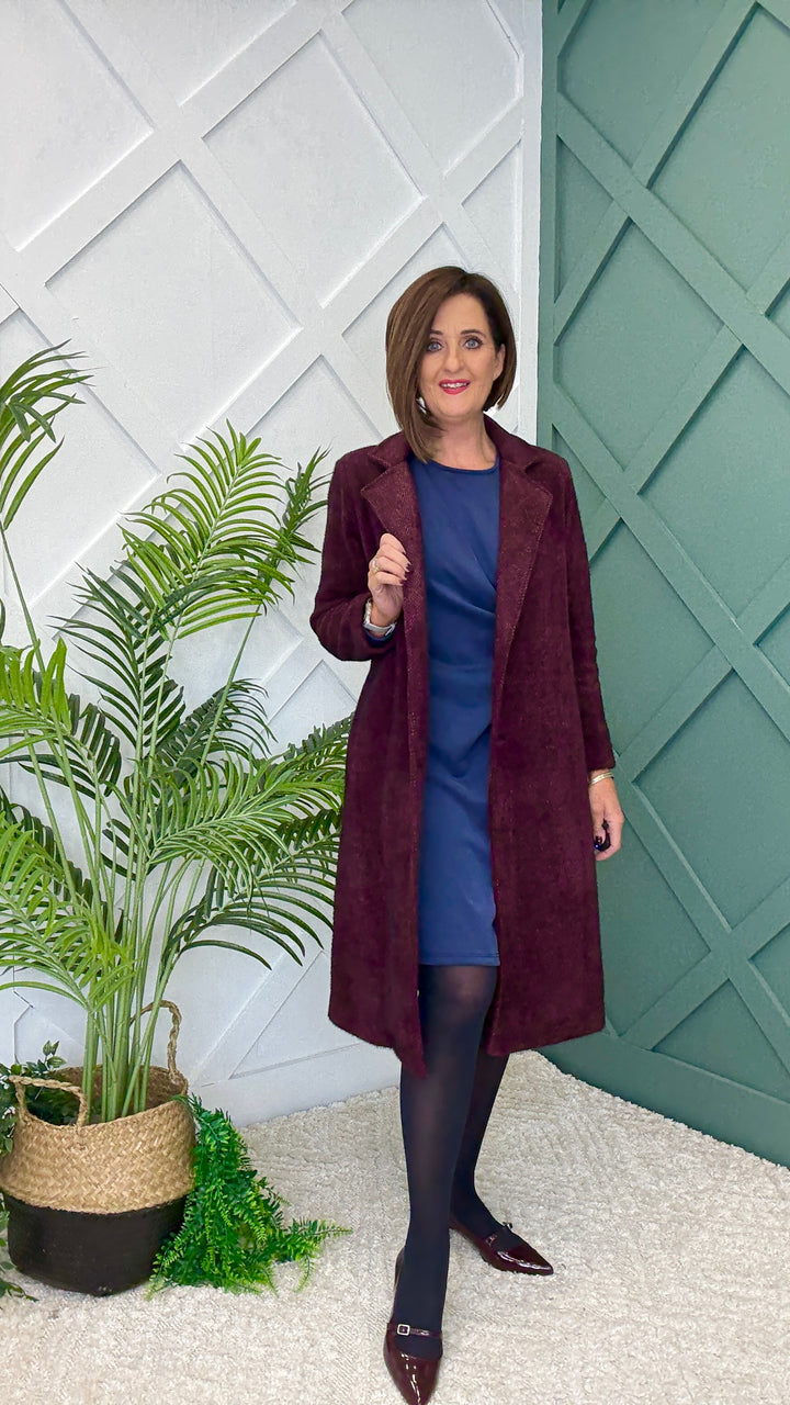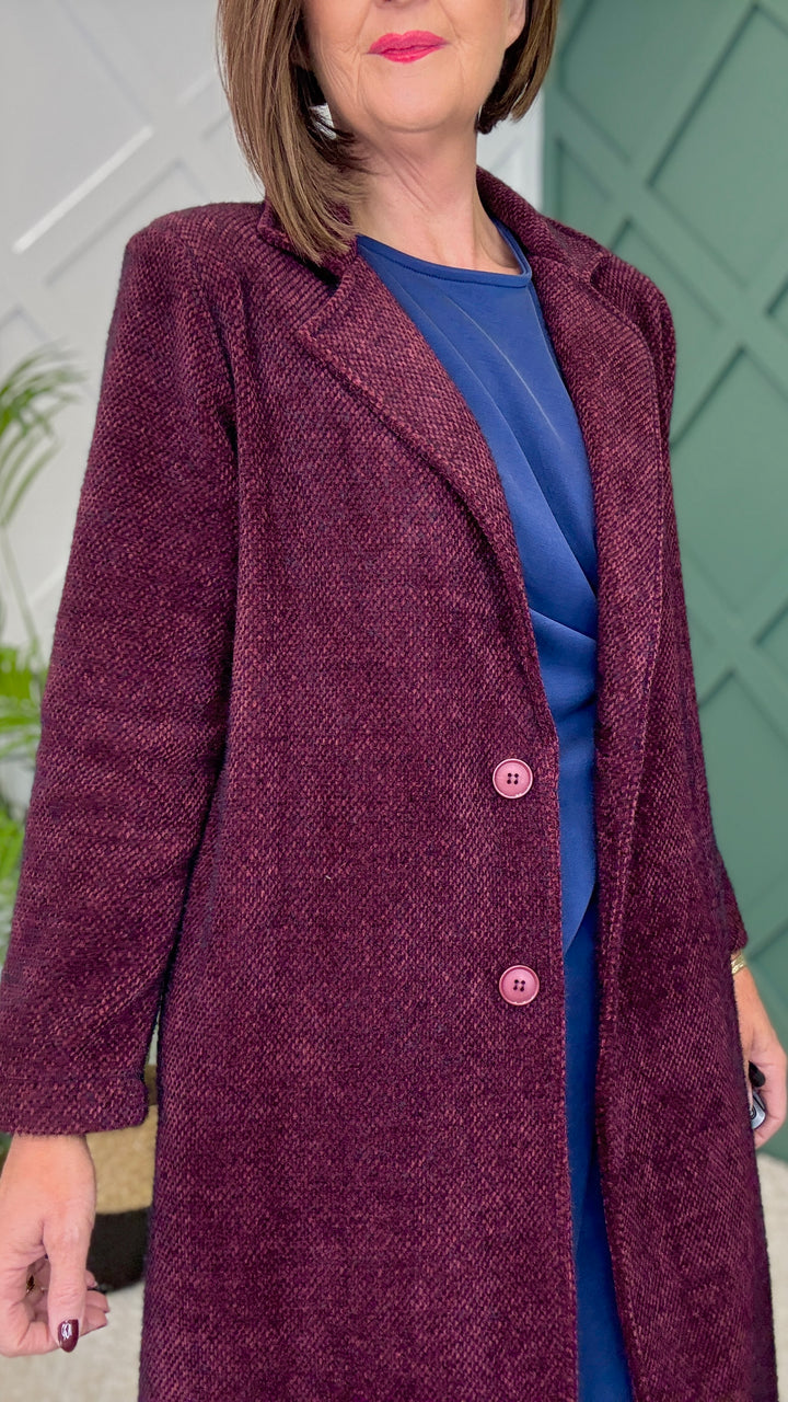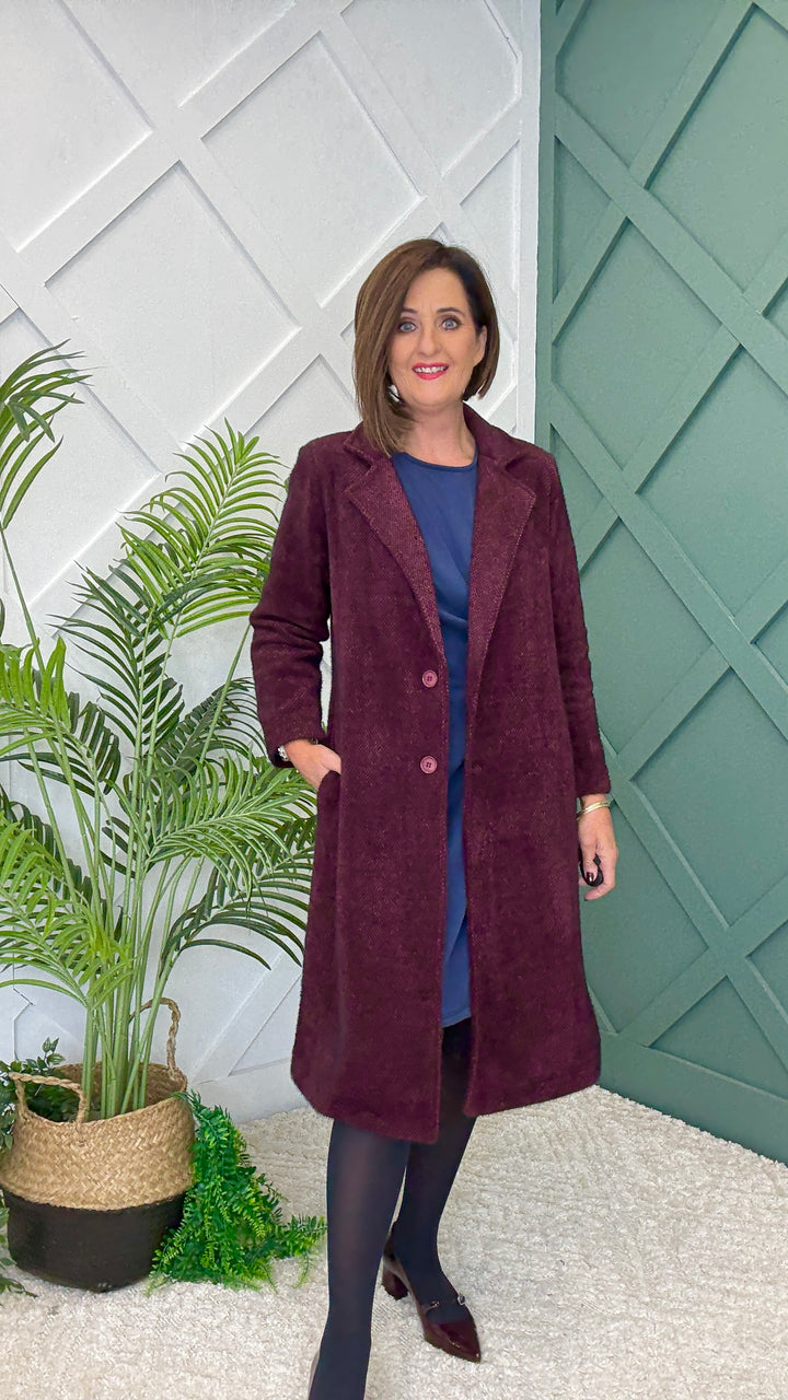 Crafted in a rich burgundy with subtle dark tones, this jacket is designed with a structured collar and lapel and a sleek double-button closure. The long sleeves and two side pockets add practicality without compromising on style.
