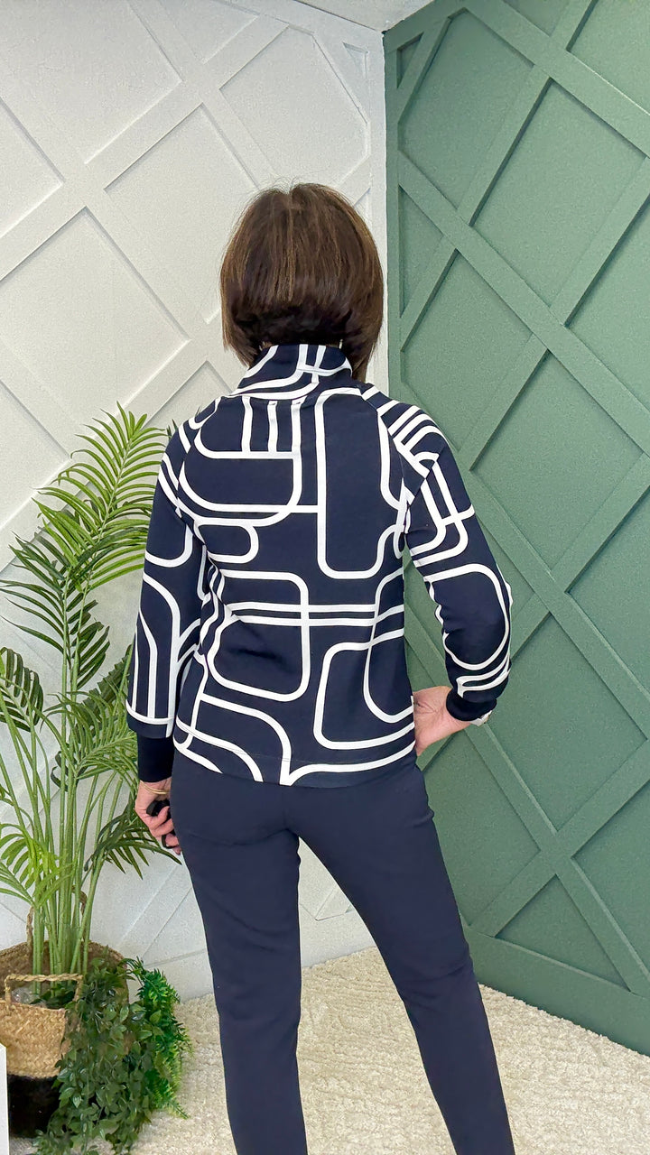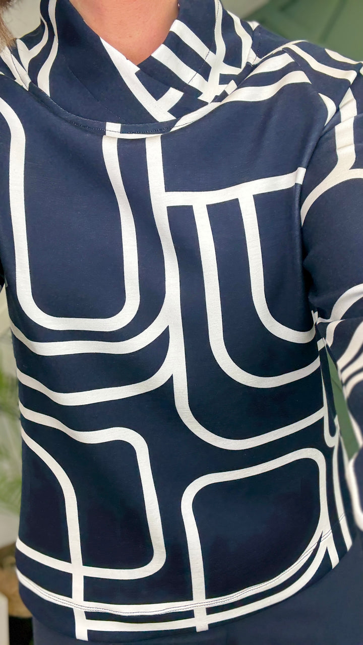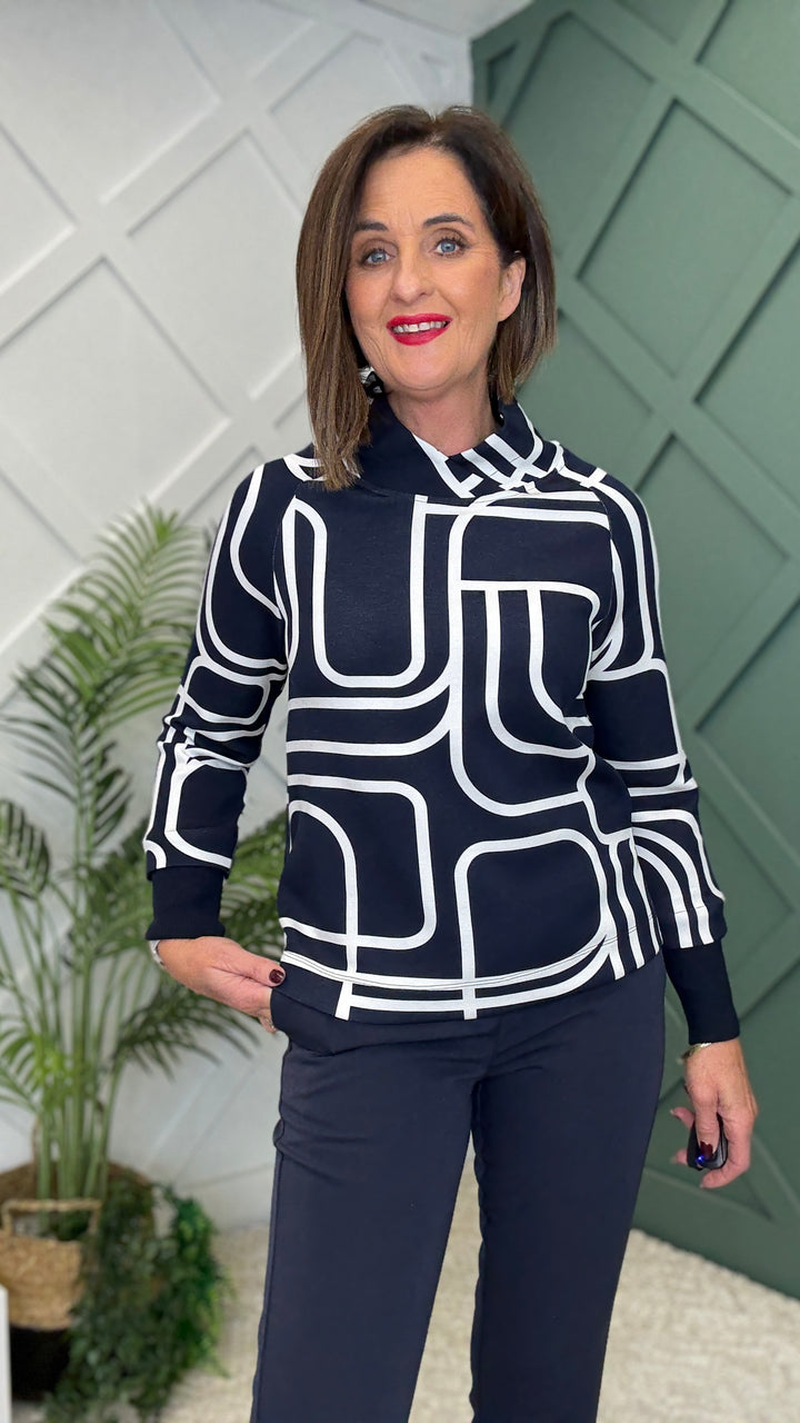 Our stunning Judith Top features a chic crossover neckline and long sleeves with beautifully exaggerated ribbed elasticated cuffs ✨. The design showcases a lovely navy and winter white pattern ❄️💙, perfect for timeless style.