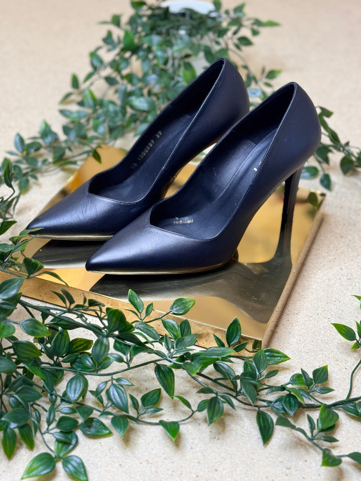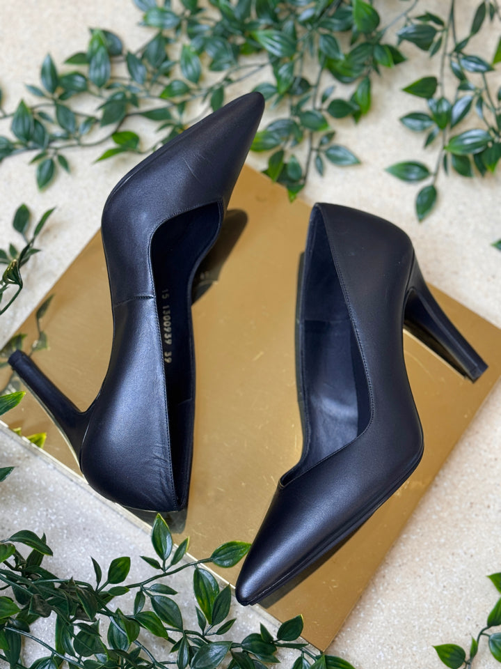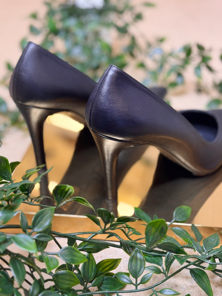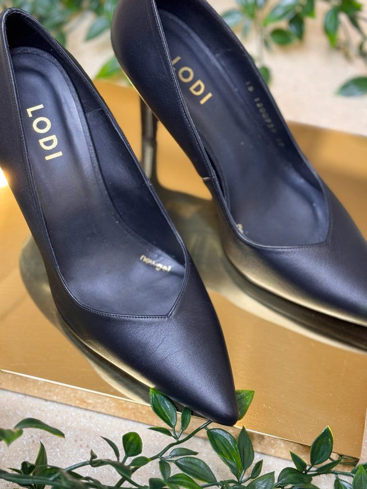 Elevate your look with the timeless sophistication of the LODI Leather Stiletto Heels. These stunning heels feature a sleek pointed toe and a matte black finish that exudes confidence and class.
