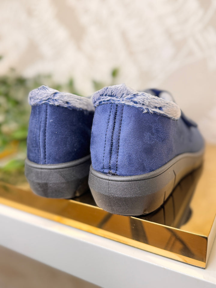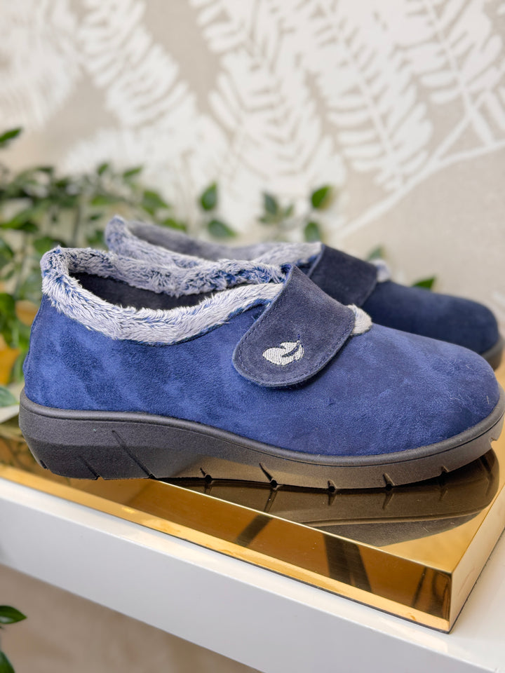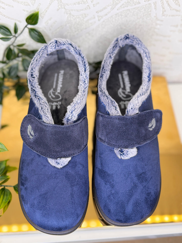 Experience everyday comfort with our Ladies Full Slipper in Navy, designed to keep your feet cozy, supported, and gently refreshed. This classic full-coverage slipper features a soft, cushioned interior and an easy Velcro strap, giving you a secure, adjustable fit throughout the day.