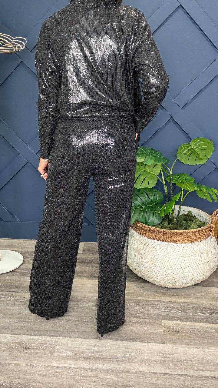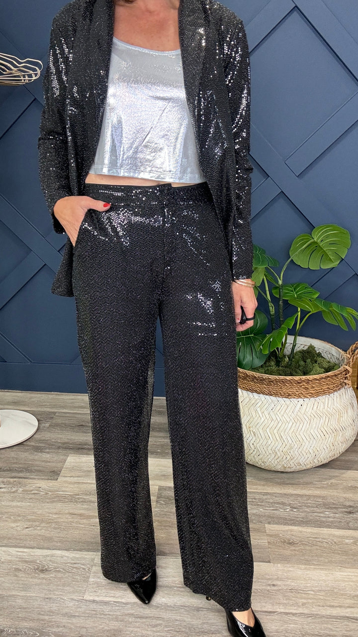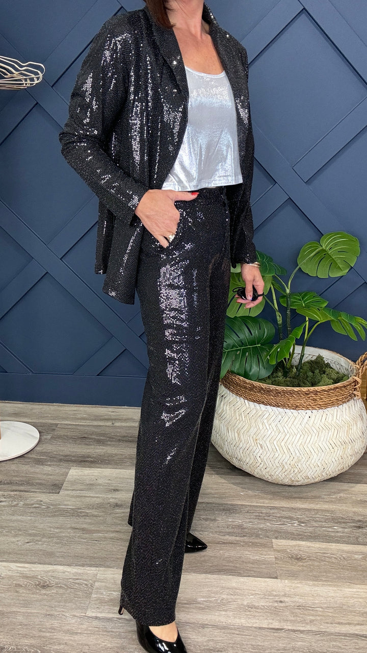 These are a lovely trousers ladies. They have a zip and hook and eye closure on the waist. There are 2 side pockets. They have a wide straight leg. But look at the detail, the sequins throughout and the silver shimmer going through them making them ideal for any night out over the festive season.