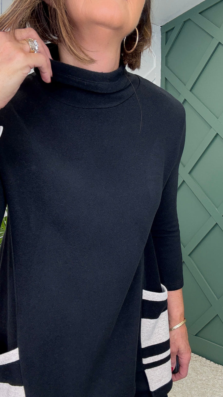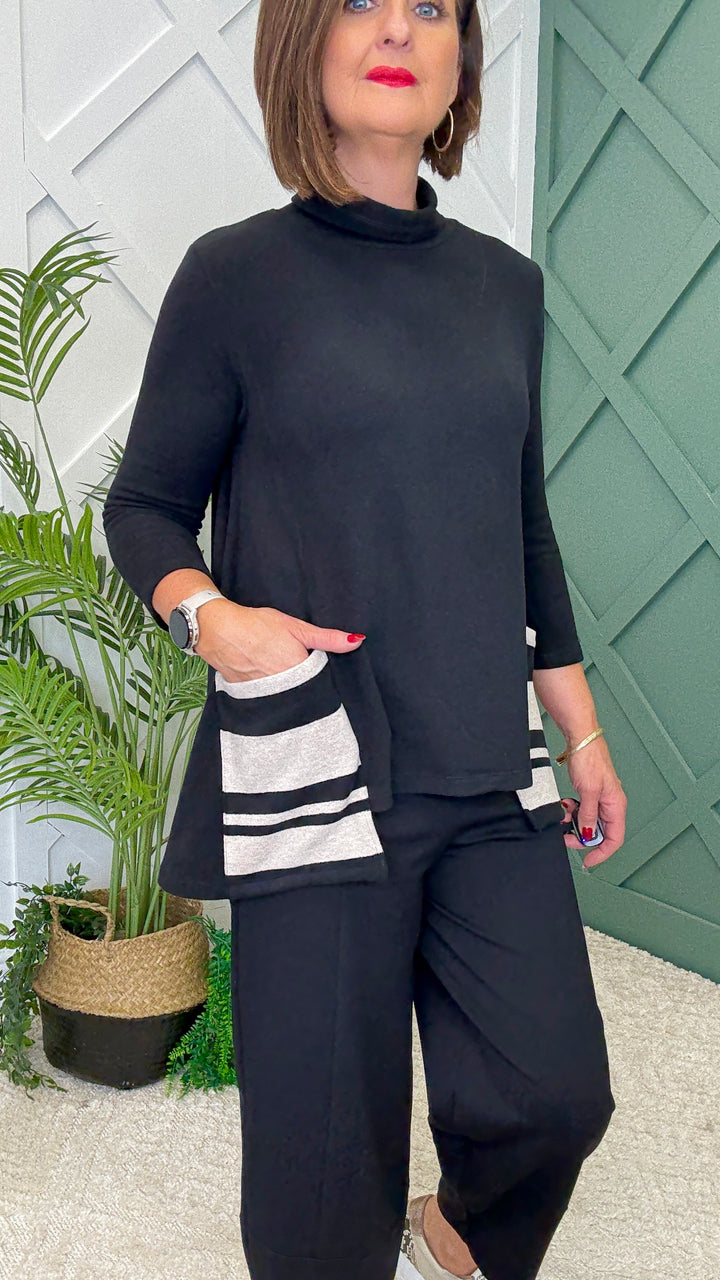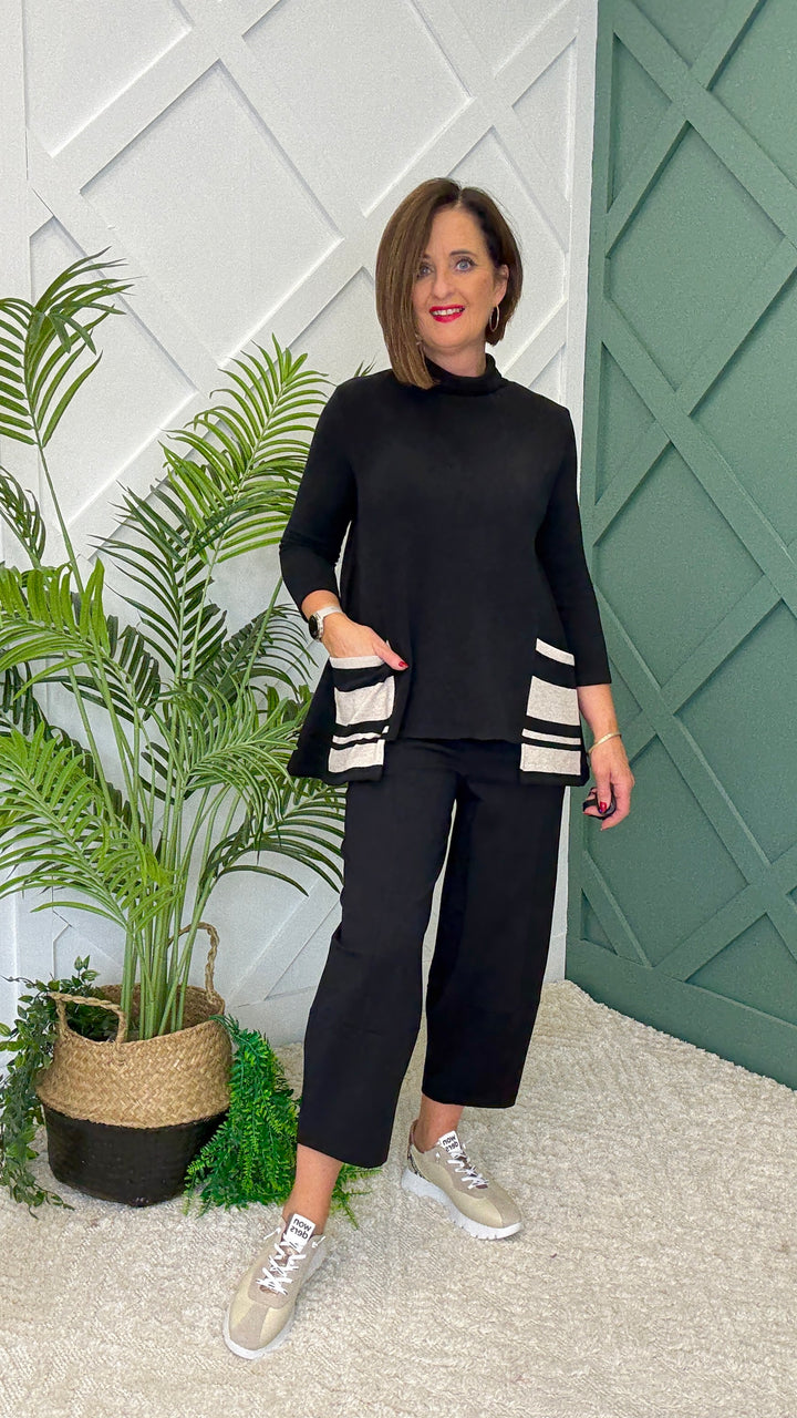 - π Striped Patch Pockets β oatmeal & black side pockets add contrast and style