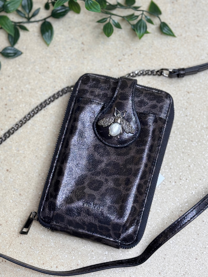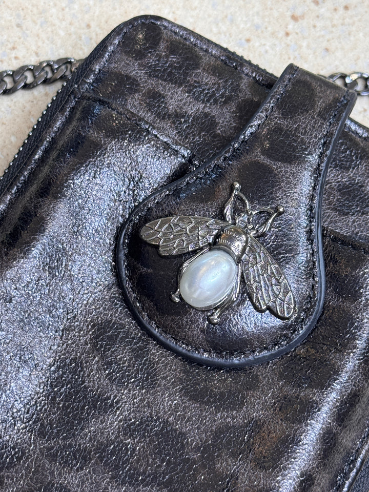 Add a touch of elegance with this Rieker crossbody bag, designed in a chic dark leopard print with a glossy finish. The standout feature is the striking silver bee embellishment with a pearl detail — a unique accent that makes this bag a true statement piece.
