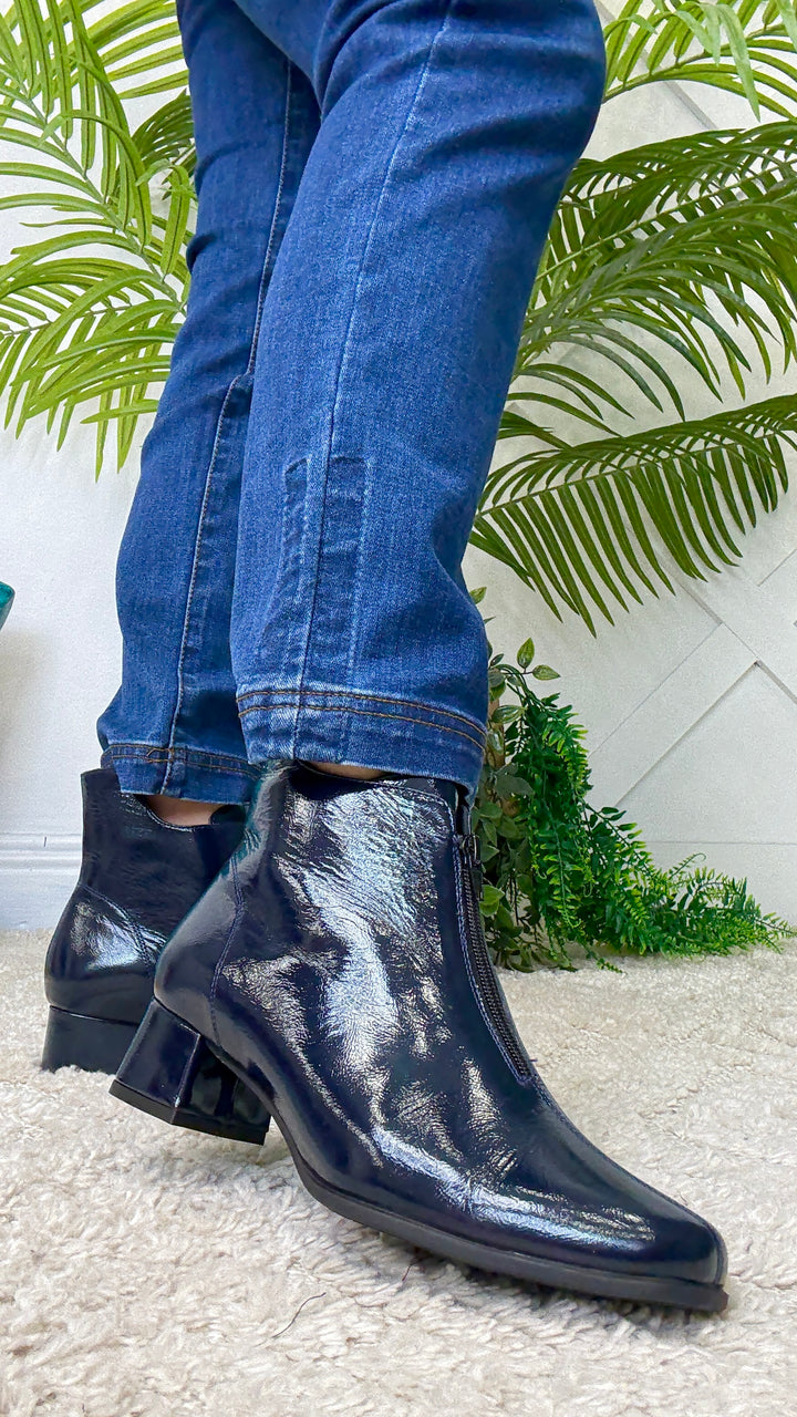 - The fabulous Sara boot from Softmode in a beautiful green hi shine leather is a fabulous addition to any wardrobe. With a front zip opening for ease of entry and a 4.5cm block heel making it ideal for everyday use.
