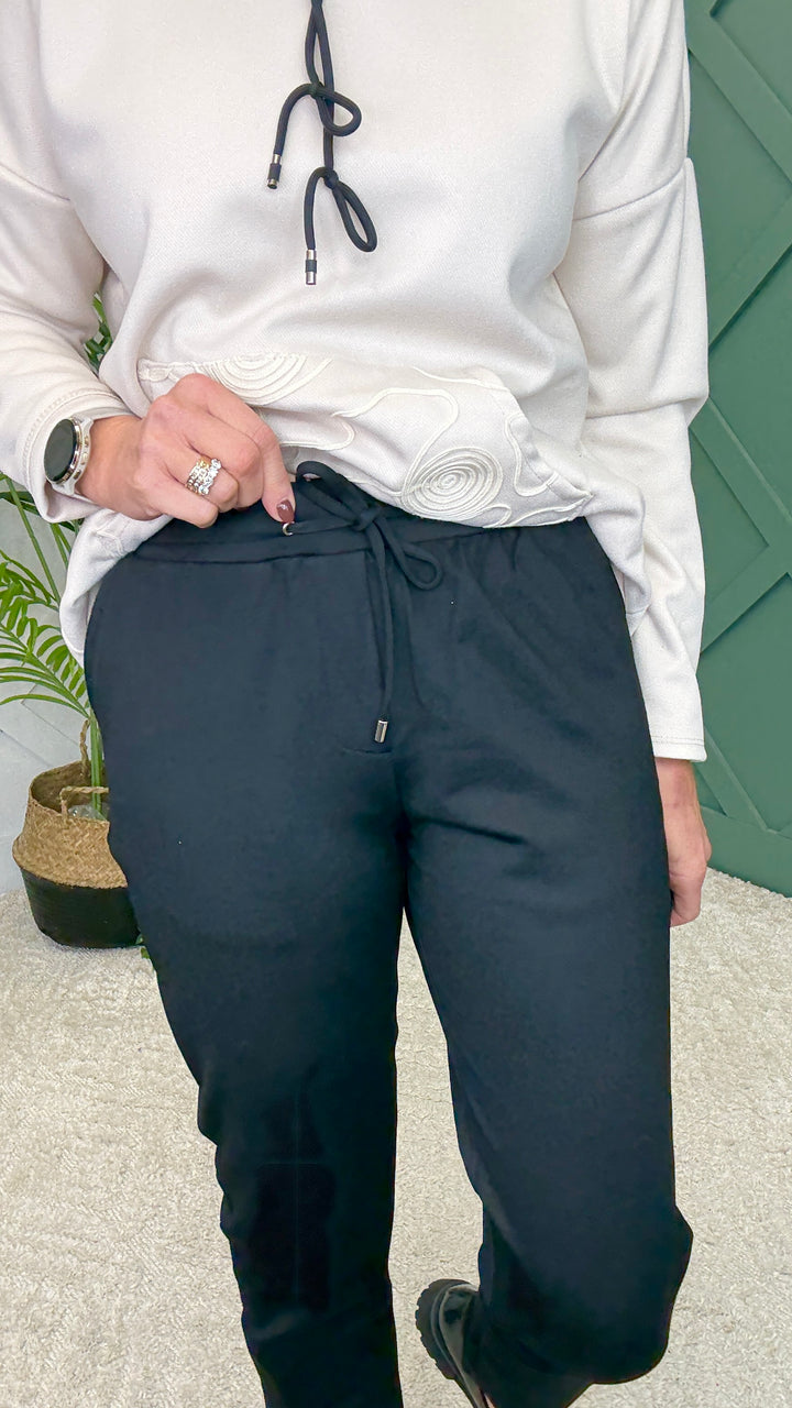 - Tabby relaxed straight leg trousers, it has a slight stretch to the fabric, has an elastic waist with a pull cord for comfort. Two front pockets with tiny black diamante.