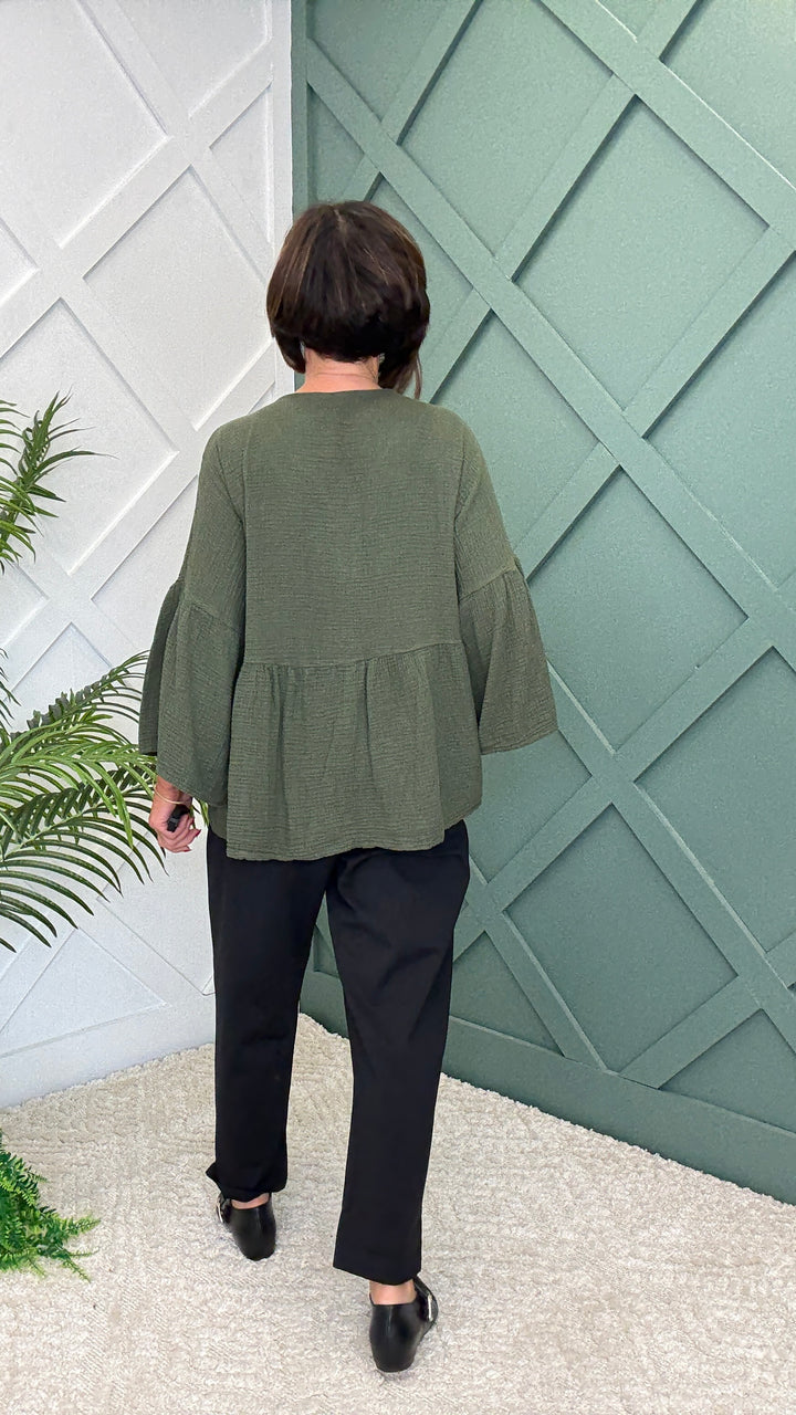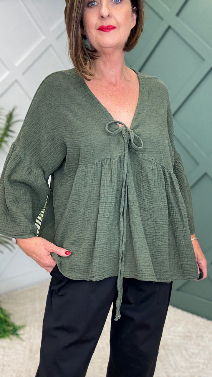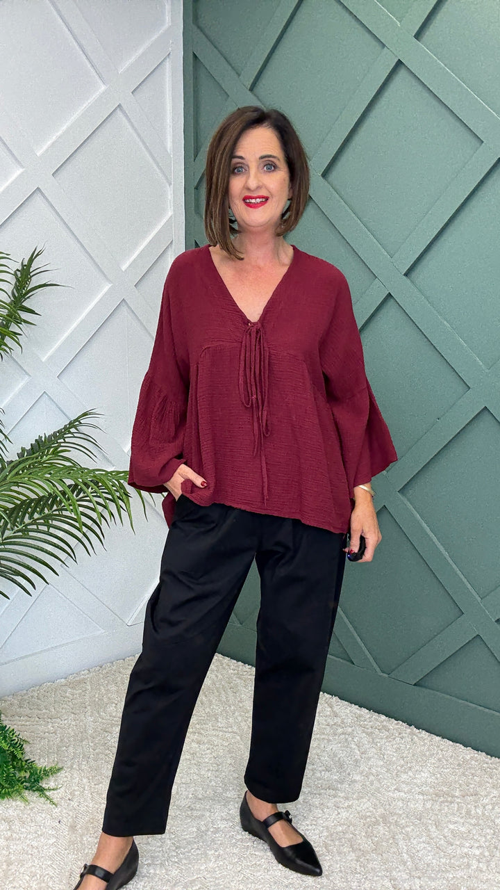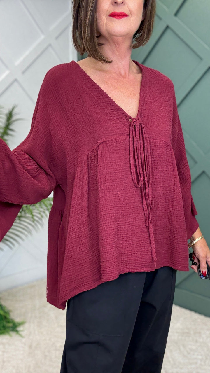 Crafted from 100% soft, breathable cotton, this lightweight piece is designed for all-day wear. The 3-quarter bell sleeves add a touch of boho elegance, while the V-neckline with delicate tie detail creates a flattering silhouette. With its flowy fit and cheesecloth-inspired texture, this top drapes beautifully, making it perfect for both casual days and dressier outings.