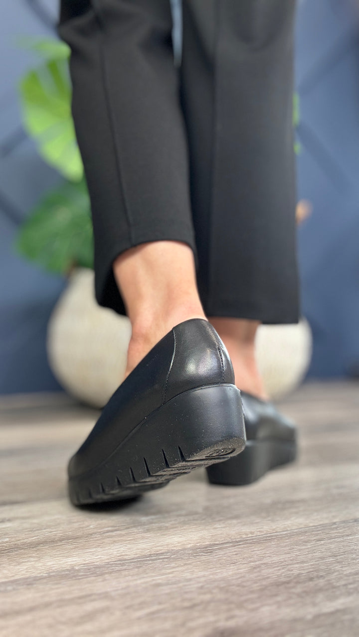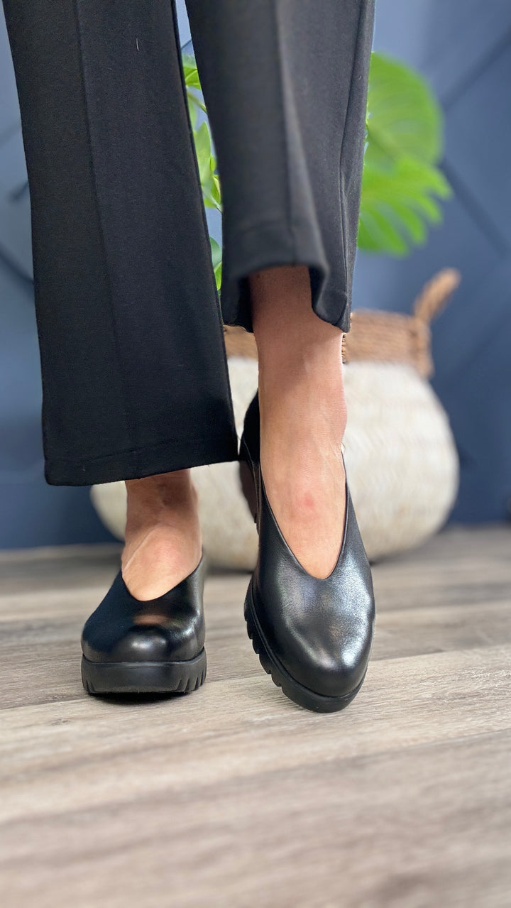 Ladies , the fabulous Carrie black leather shoe from Wonders is the essence of style, elegance and comfort, with a 4cm wedge heel and featuring Wonderfly technology guaranteeing lightness and comfort.
