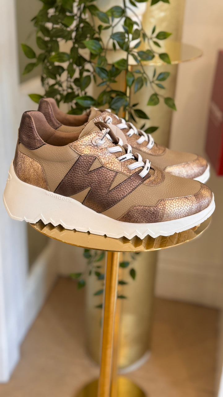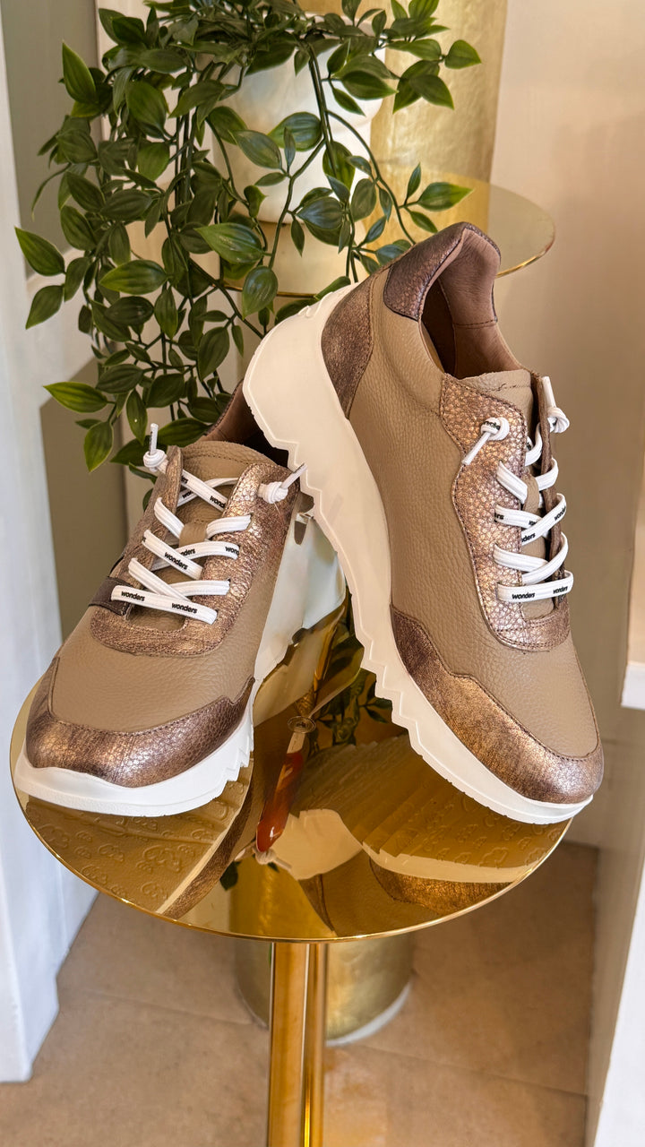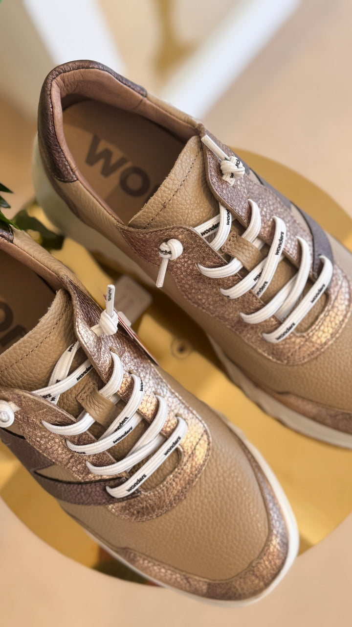 Available in two stylish colorways—Black with Bronze accents and Taupe with Bronze accents—these sneakers showcase the signature oversized Wonders “W” logo and are crafted from premium textured leather.
