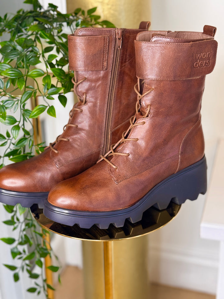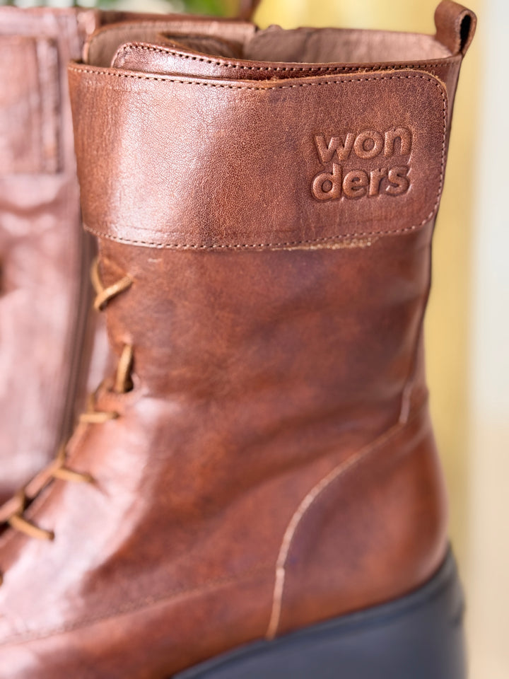 Step boldly into style and comfort with these Wonders platform combat boots. Crafted from premium smooth leather, these lace-up boots feature a chunky, rugged sole that provides excellent grip and a modern edge. Perfect for everyday wear or elevating your street style, these boots combine durability with lightweight WondersFly™ cushioning technology for unmatched comfort.